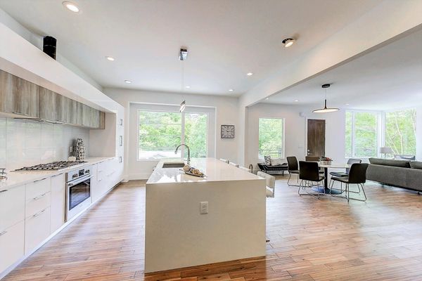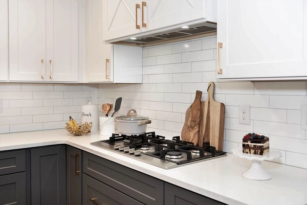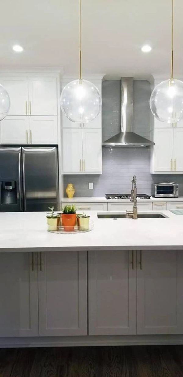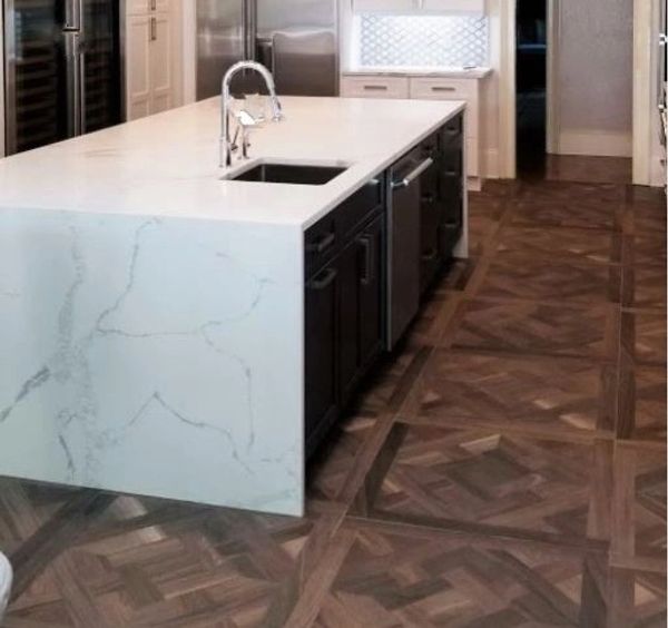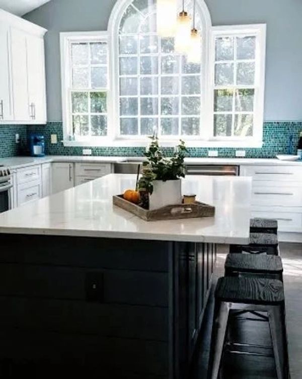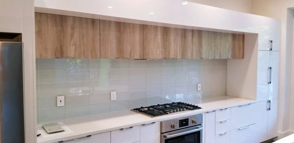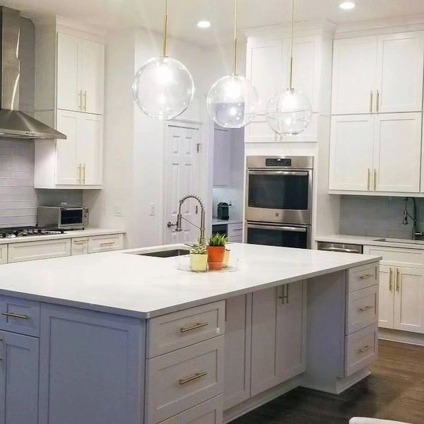 In the more recents works Kitchen Cabinets that we made, we used a blend of white Shaker cabinets and marble hexagon backsplash, Cobblestone Shaker cabinets, 1.5" waterfall Calacatta quartz and special custom order 32" Italian floor tile, Custom wood wine rack and molding on the island along with a 3" Quartz countertop in Artic White and a blend of shiny modern cabinets and textured wood choices
